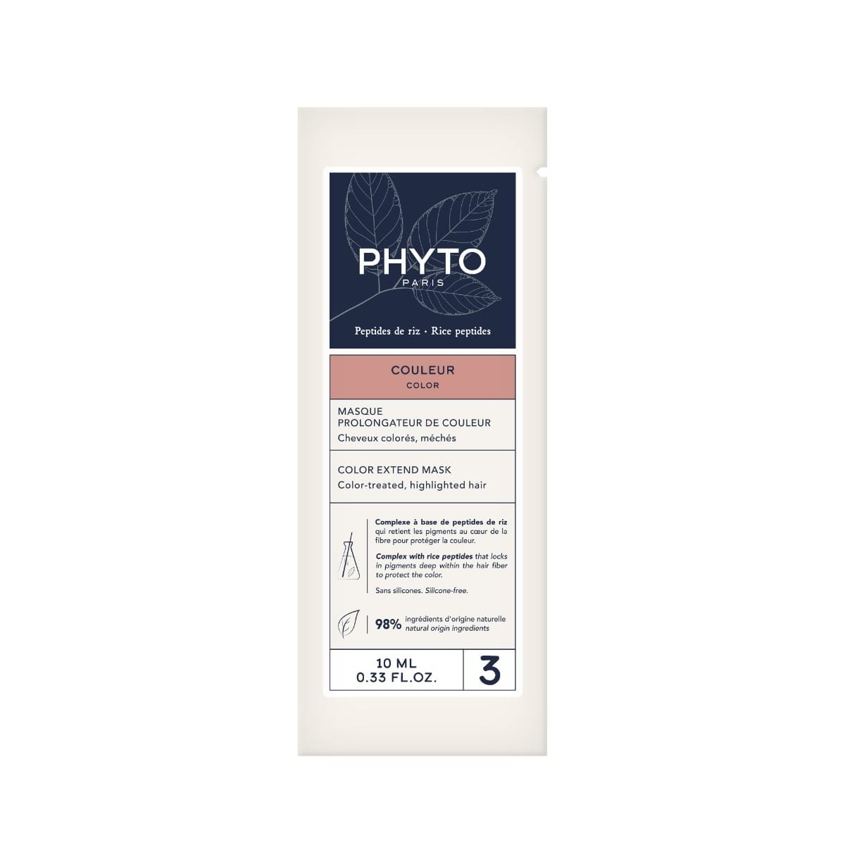 DIESE VERPACKUNG ENTHÄLT: 1 Flasche Entwicklermilch 1.69 fl. oz. - 1 Tube Farbcreme 1.69 fl. oz. - 1 PHYTO PARISCOLOR Maske 0.40 fl.oz. - 1 Beipackzettel - 1 Paar Handschuhe.