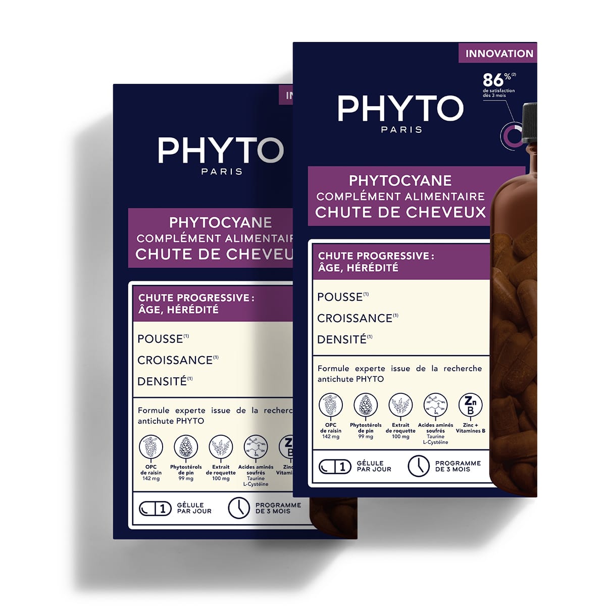 Um die Wirksamkeit zu verstärken, kombinieren Sie Ihr PHYTO PARISCYANE Anti-Haarausfall Nahrungsergänzungsmittel mit PHYTO PARISCYANE FEMME oder MEN, der topischen Behandlung gegen fortschreitenden Haarausfall.