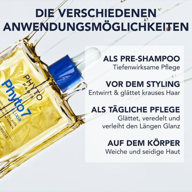 Auf die Längen auftragen, dabei besonders auf die Spitzen achten. Ein Öl mit vielfältigen Anwendungsmöglichkeiten: